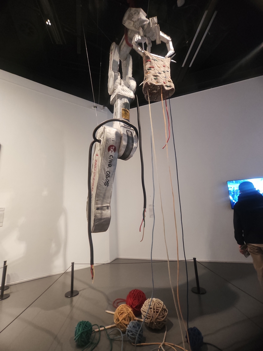 一条纤维制的机械臂被麻绳吊在半空,正编织着一条围巾。创作者王棕正说,有很多独属于人类的温度和情绪,看似无用、低效,却是算法难以捕捉的美。“科技能模仿人类的动作,却无法理解动作背后的情感投入——这恰恰是人类最珍贵的部分。”他说。