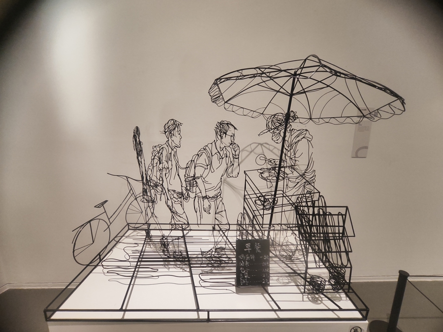 创作者郭祺把丰子恺画风的平面速写“拉”成3D——金属“线条人”摊煎饼,排队者伸长脖子,等那口热乎的美味。从正面看,众人都在静悄悄地等待;从侧面看,人物仿佛交换了位置,互动起来。有留学生参观者感慨,自己经常用软件点外卖,甚至尝试无人机送餐,却很少体验这样的排队购买。